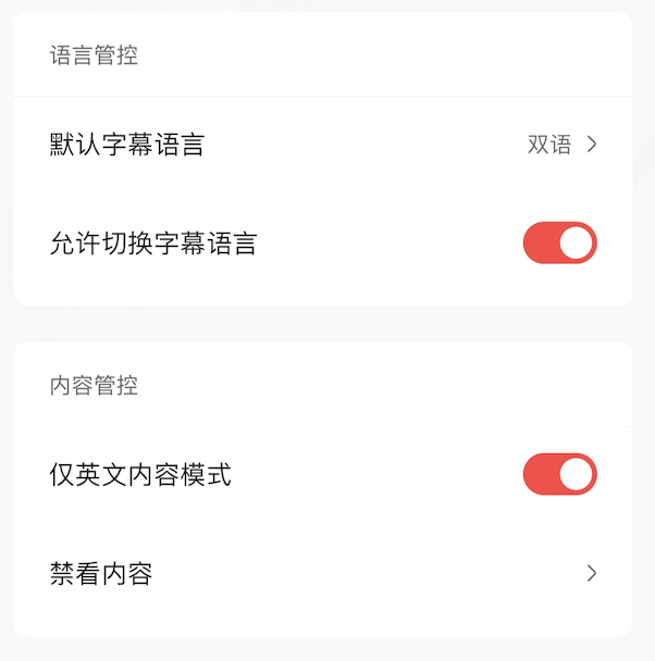 在家长模式下,“我的”里面,可以针对语言、内容、和播放时间进行非常细致的管控。