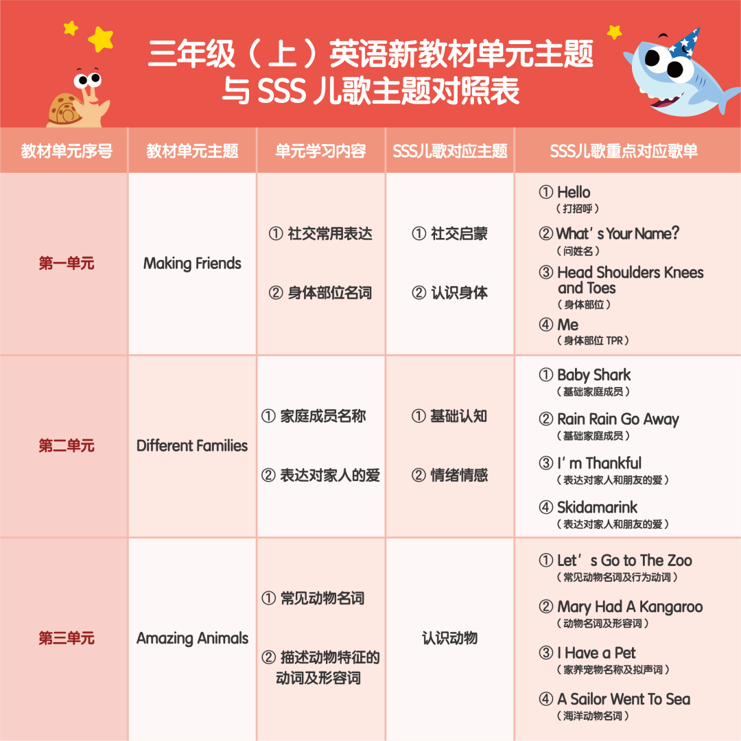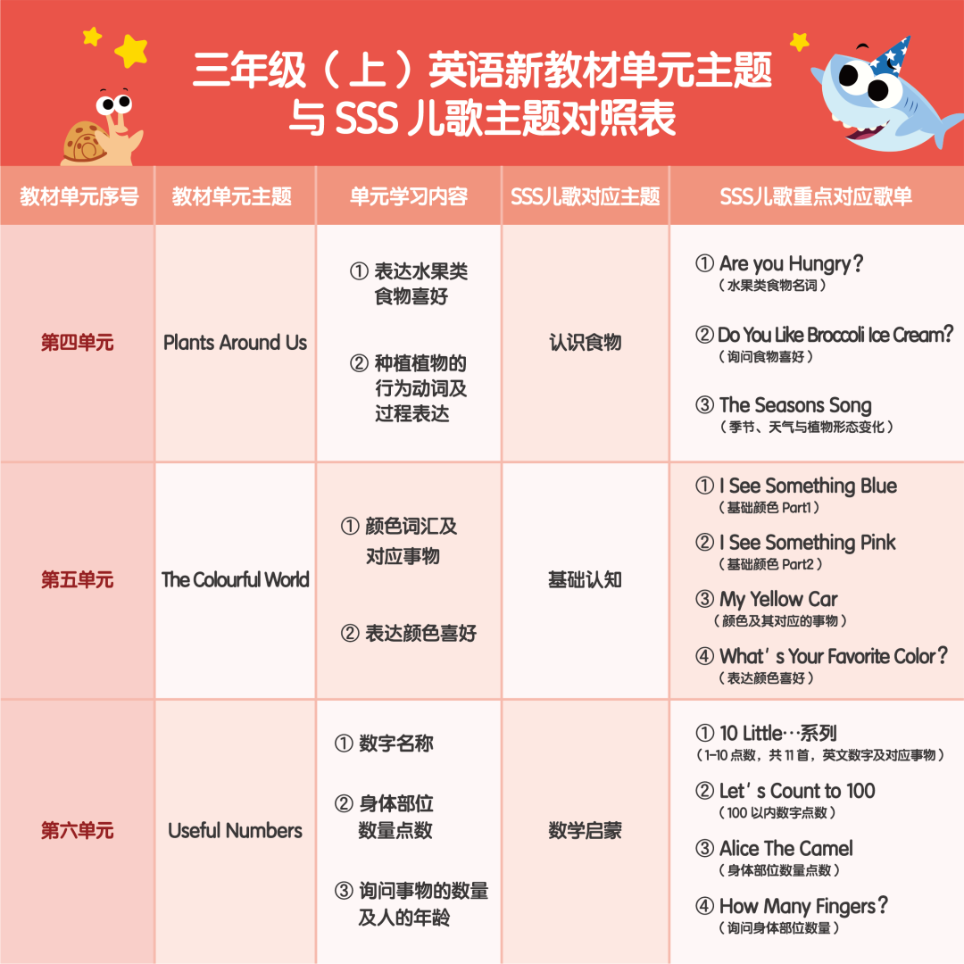 毕竟他们在0基础时看的最简单的SSS儿歌,就包含三年级英语教材好多词汇了,看下面这张表,改版后的新教材,好多话题都可以和SSS儿歌直接无缝对接!