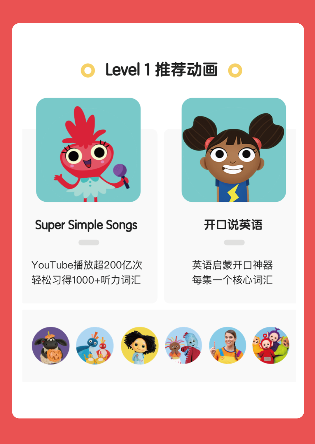 Level2:适合听力词汇400+孩子,从儿歌过渡到慢速动画,继续积累听力词汇,逐渐理解更多日常表达,并且接触字母和自然拼读入门。