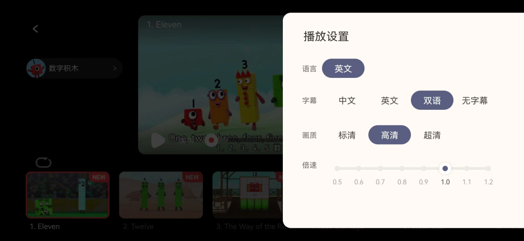 观看动画片时,如果觉得语速太快或者字幕不太合适,点击右侧的三个点扩展按钮,就可以找到,8级倍速和4种字幕设置。