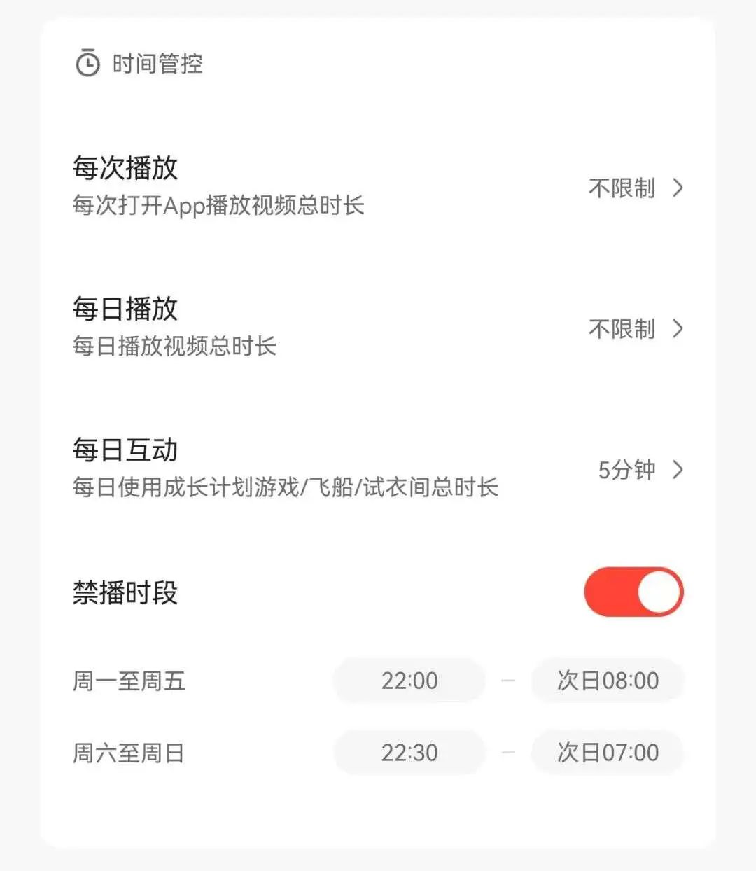 在家长模式下, 进入“我的”,进行观看时间管控,调整每次播放时长和每日播放时长。