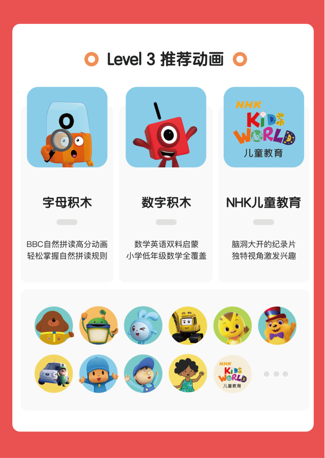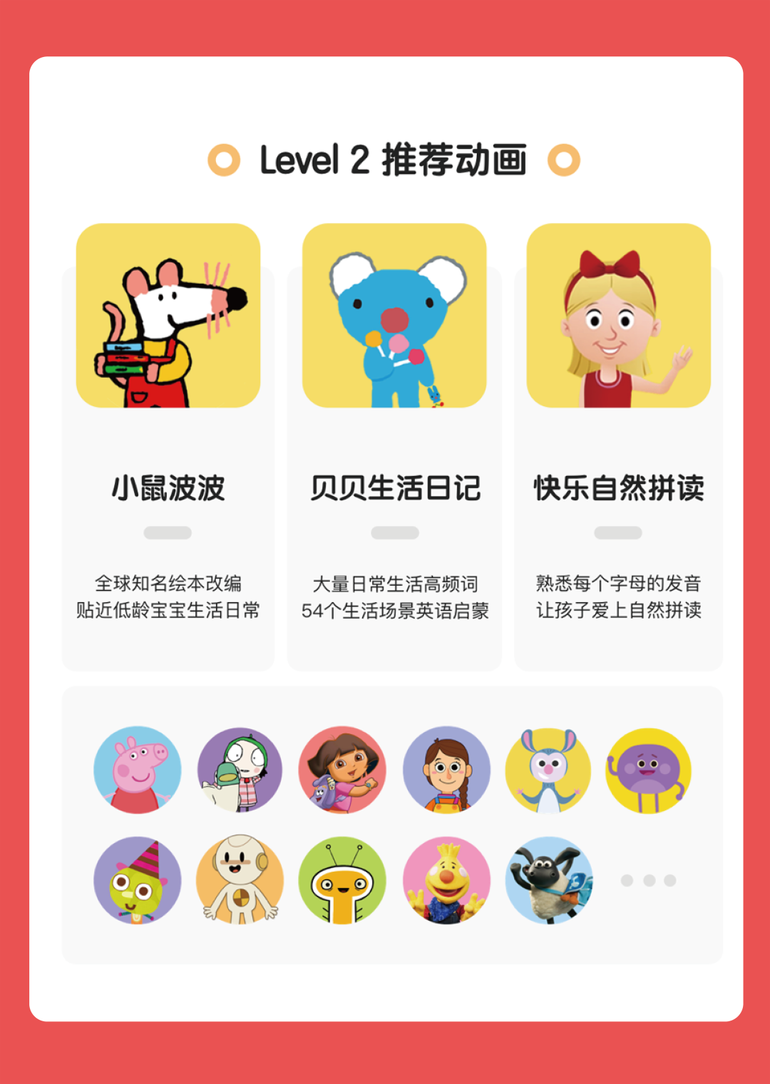 代表动画小猪佩奇、小鼠波波、蓝色小考拉、爱探险的朵拉和快乐自然拼读等。
