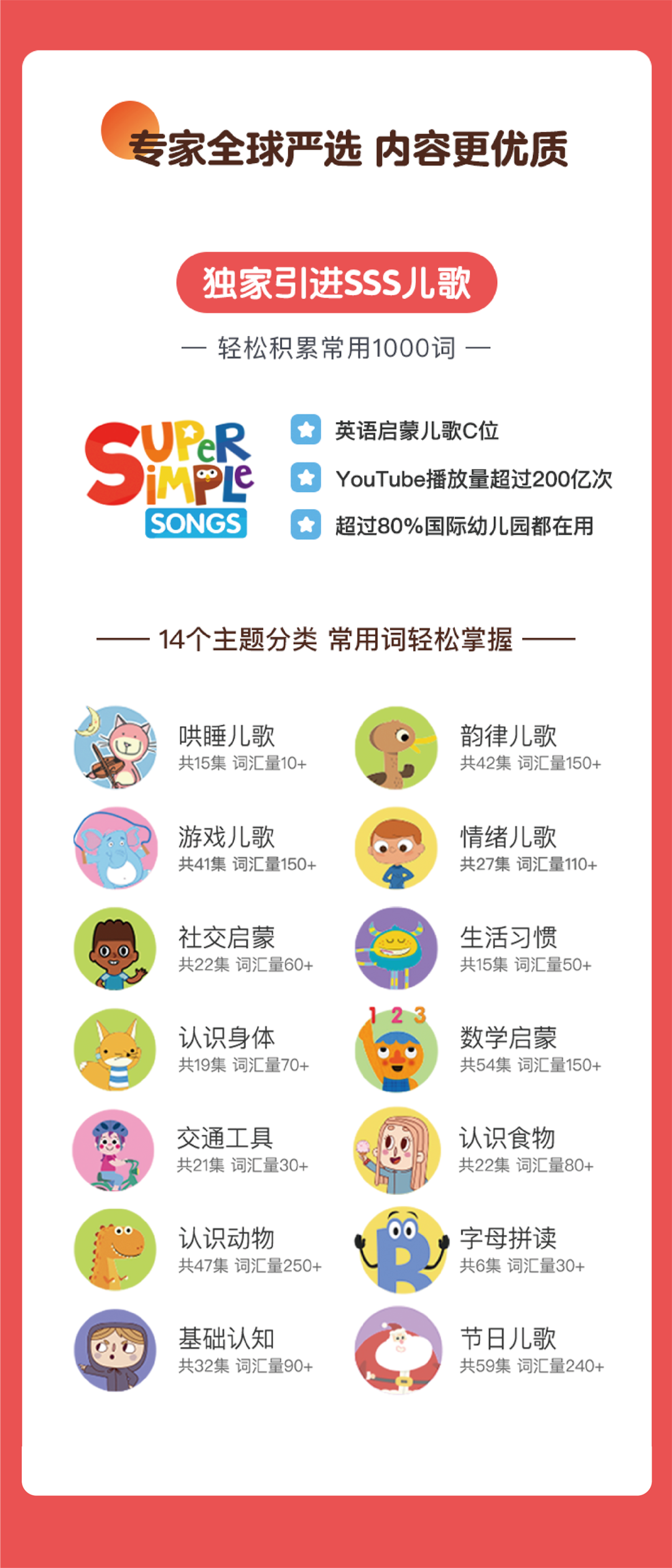 小小优趣还将近300首SSS儿歌做了14个主题分类,涵盖各个生活场景,并照顾到了不同孩子的英语启蒙需求。