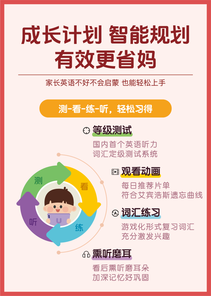 成长计划能为普通家庭解决“英文动画看什么,怎么看,能收获哪些有效词句”的问题。跟着“成长计划”持续坚持,完成24个阶梯的内容,能习得超过20个常用场景、2500+听力词汇、350+语句!相当于初中毕业生的听力水平!