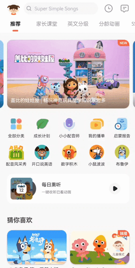 根据定级测试结果,每天智能生成动画观看计划,就跟着系统推荐走就行了,老母亲再也不用费力给娃找动画了,再也不用操心应该看哪一部最合适了。