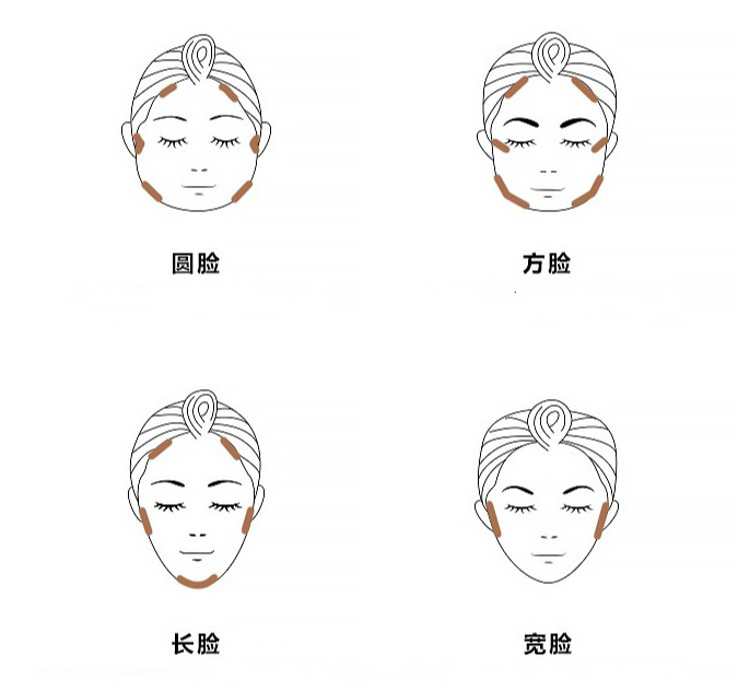 圆脸的特点就是面部没有线条感,非常柔和。看起来很可爱,但也易显脸大,没有时尚感,与精致无缘。所以圆脸修容重点沿着发际线向两侧垂直向下,一直到下巴尖,拉长脸型。同时提亮面部中央,塑造立体感。下颌位置从耳后沿着下颌骨向下,画出线条感。