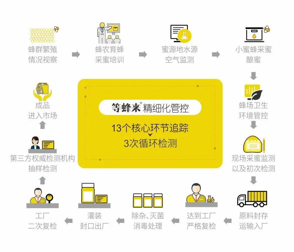 每一瓶蜂蜜,从源头开始,需要经过13个核心环节追踪,3次循环检测,以确保每一滴蜂蜜,从花蕊到舌尖,都保留其自然气息。