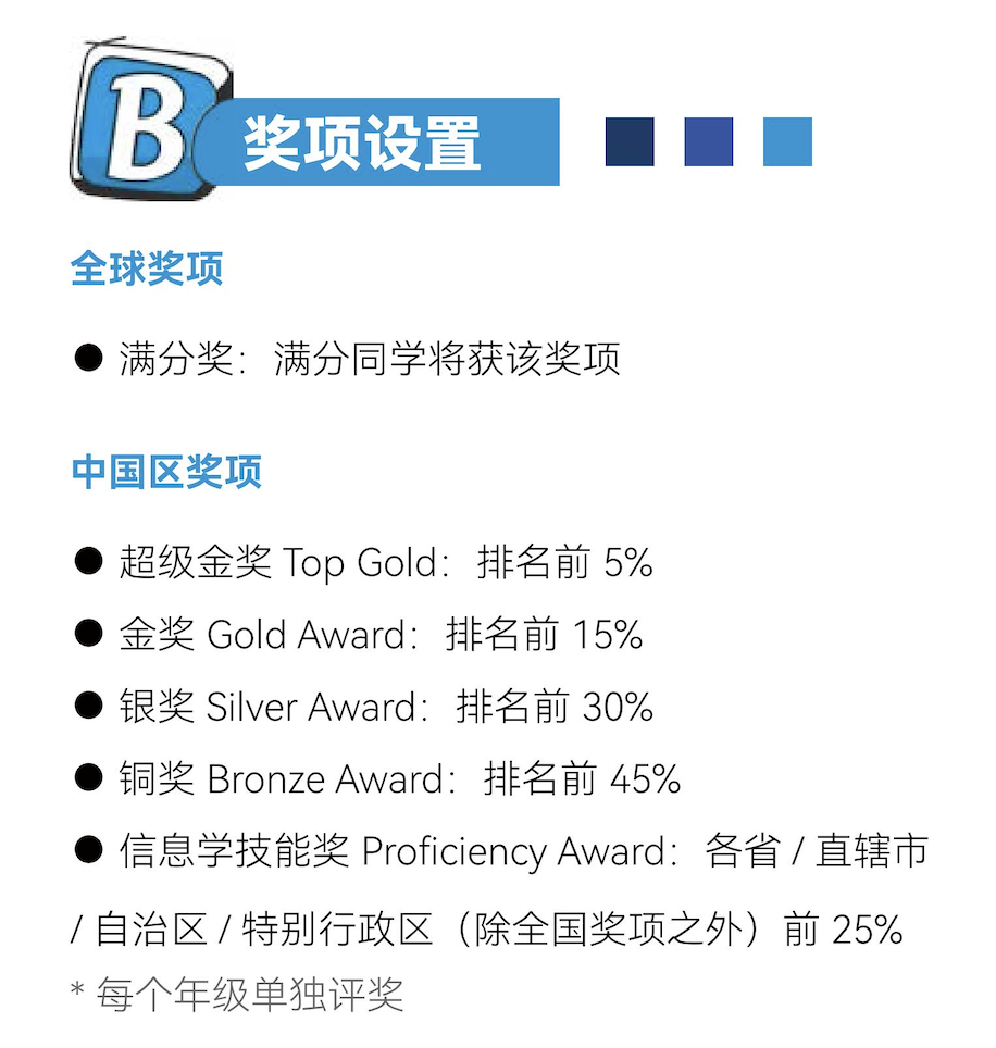 ●信息学技能奖Proficiency Award:各省/直辖市/自治区/特别行政区(除全国奖项之外)前25%