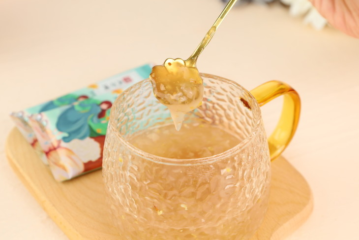 藕粉半透明质地,晶莹剔透,色香味俱全。点缀着银耳小颗粒,飘散着桂花香气,让人食欲满满,迫不及待想要尝上一口。