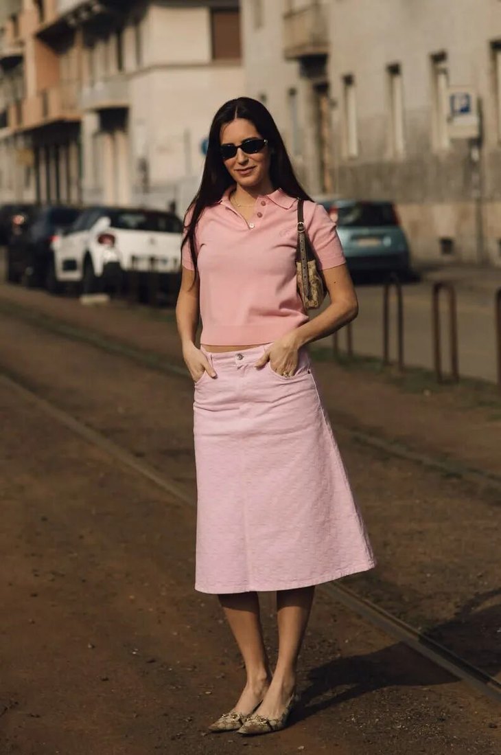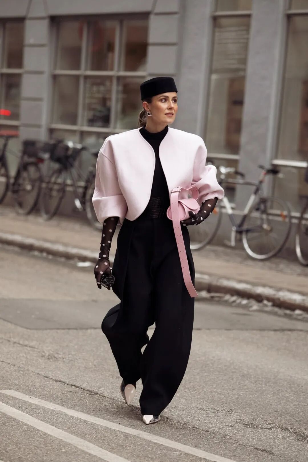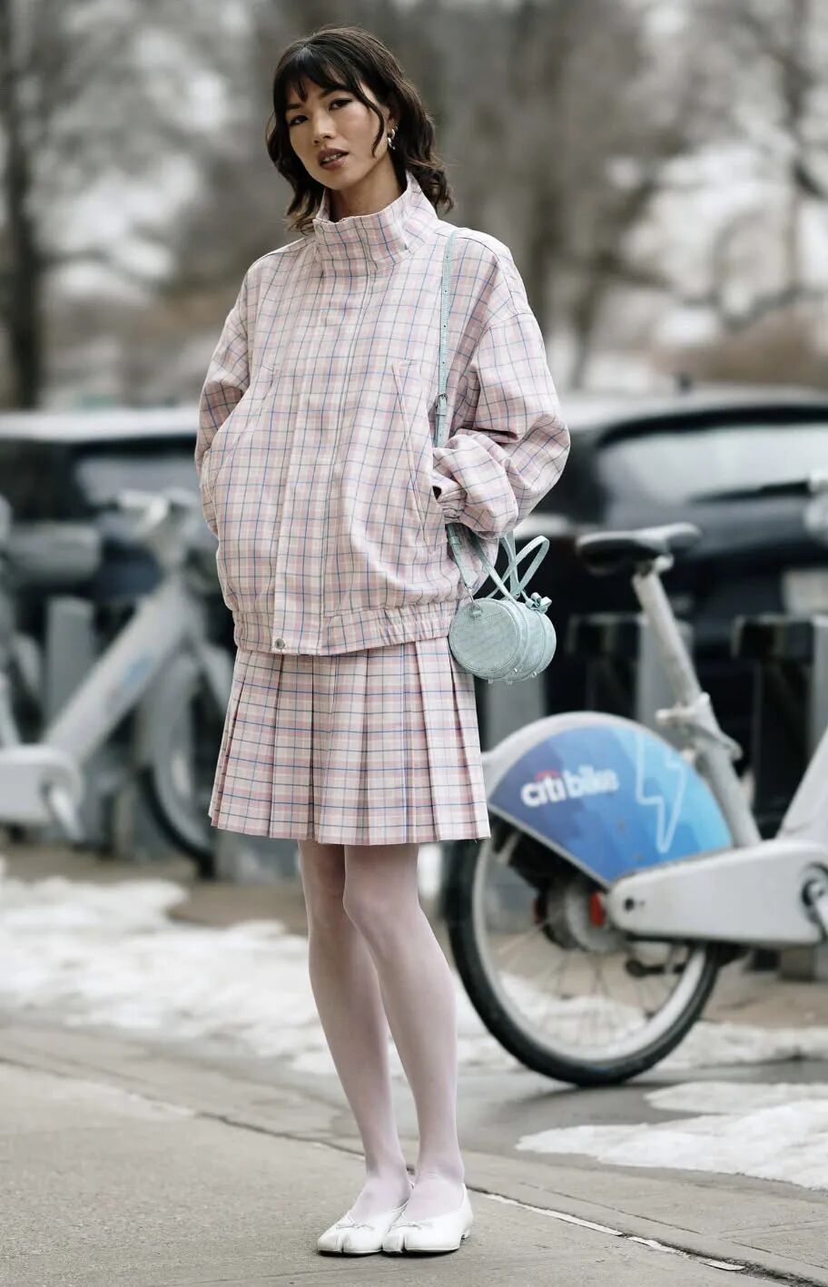 相反,一身奶油粉在春日里走着,倒像是把整个季节的温柔都穿在了身上。
