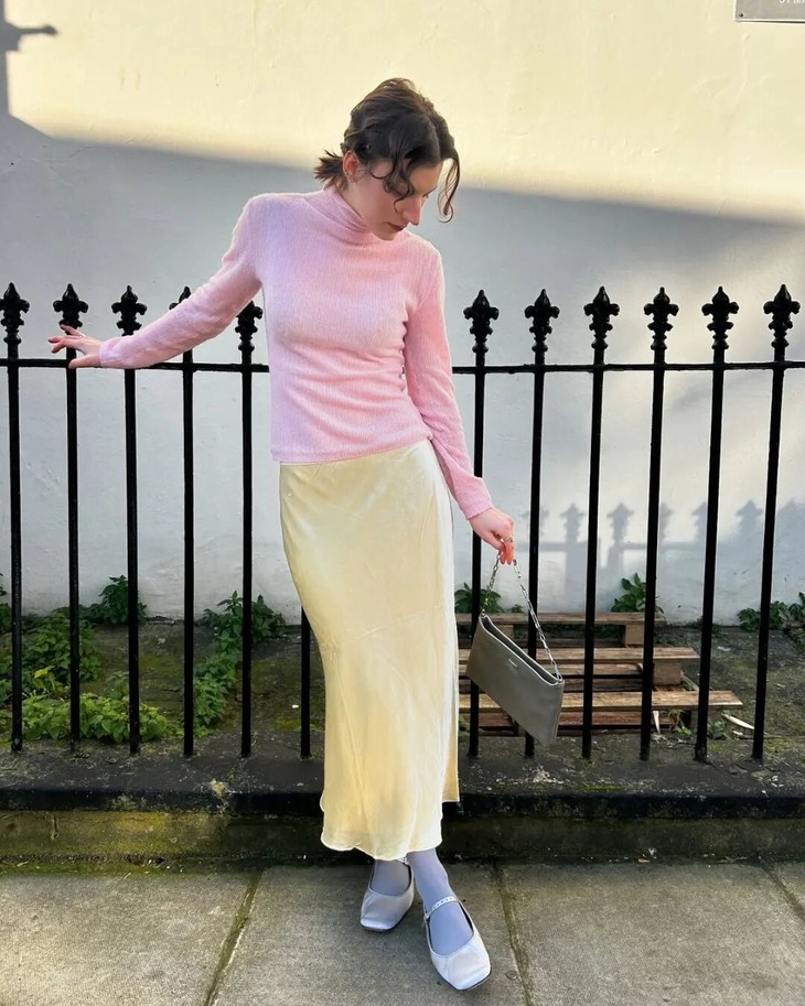 而春天毕竟是适合尝试的季节,奶油粉也很适合和其他色彩碰撞: