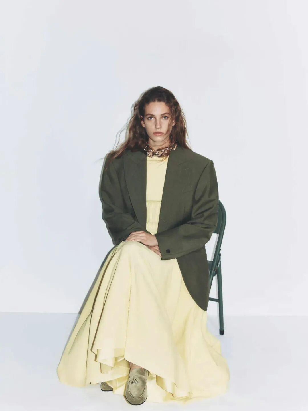 也适合和中性色搭配,一件奶油黄的毛衣配一条卡其色的裤子,或是搭在深蓝色的衬衫外面,温柔里透着恰到好处的力量感。