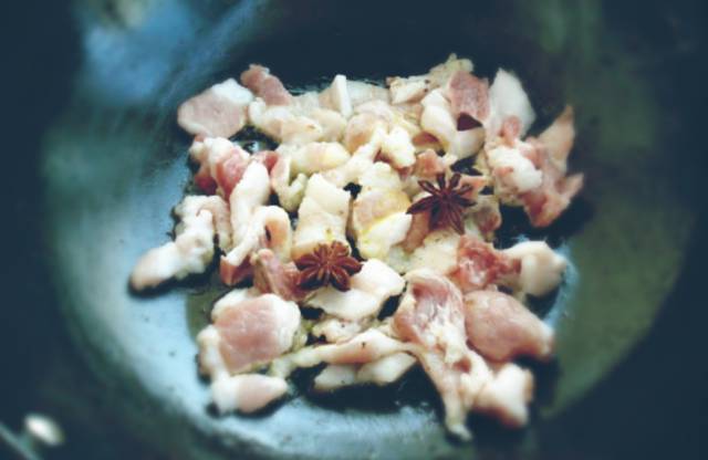 1、热锅凉油,先放肉,炒到微微发黄,大料瓣、葱段、姜片入锅炒出香味;