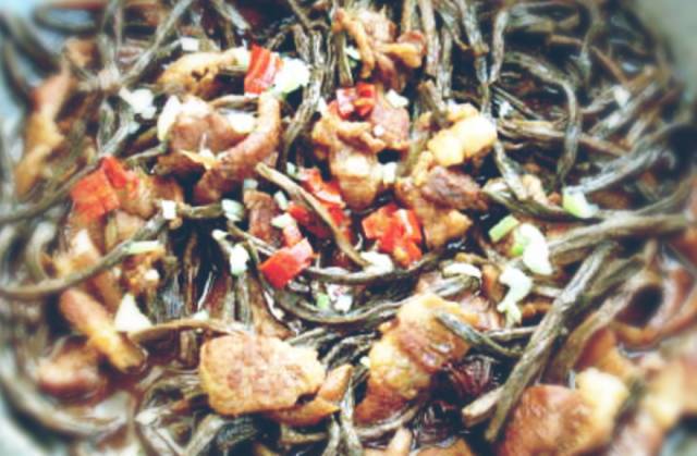 干豆角3两,干豆角的原料有豇豆和四季豆两种,我们选择豇豆的,挑选的时候,我们要注意有硫磺、漂白粉、福尔马林味道的,不是自然晾晒的,不要买。