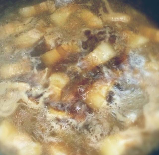 2、放入4勺生抽,多半勺老抽,黄酒2两,1-2块冰糖,1片-2片白芷,1斤水;