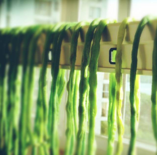 3、将沥干水分的豇豆放在阳光充足且通风的地方晾晒,直到没有水分。