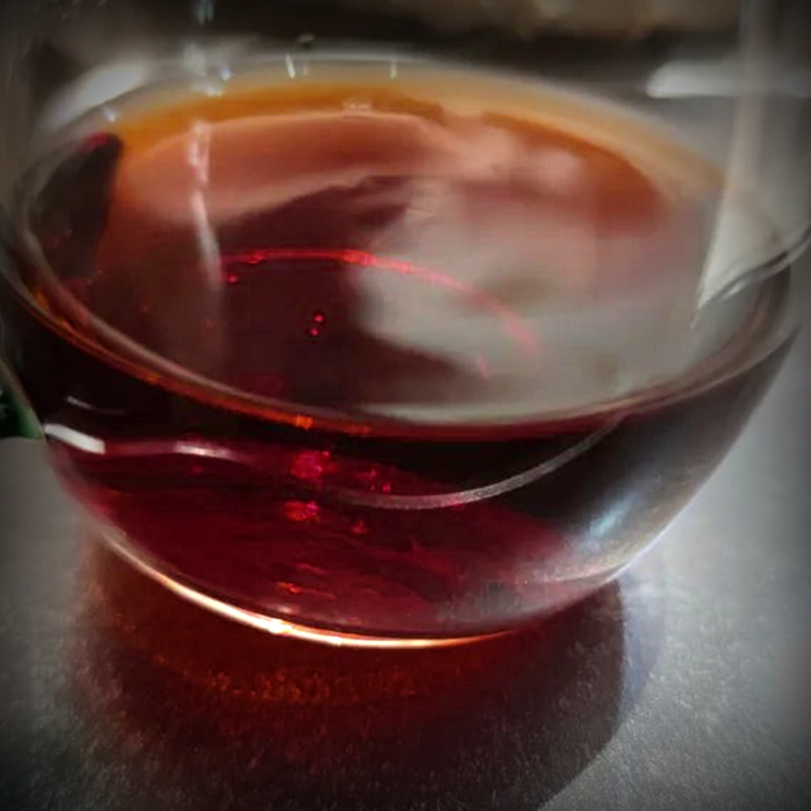 充满了陈茶之气韵,优雅柔顺,汤色通透明亮,栗中带红,茶汤入口厚滑甘醇,数泡之后回甘明显,叶底甜香之中带陈沉木香。