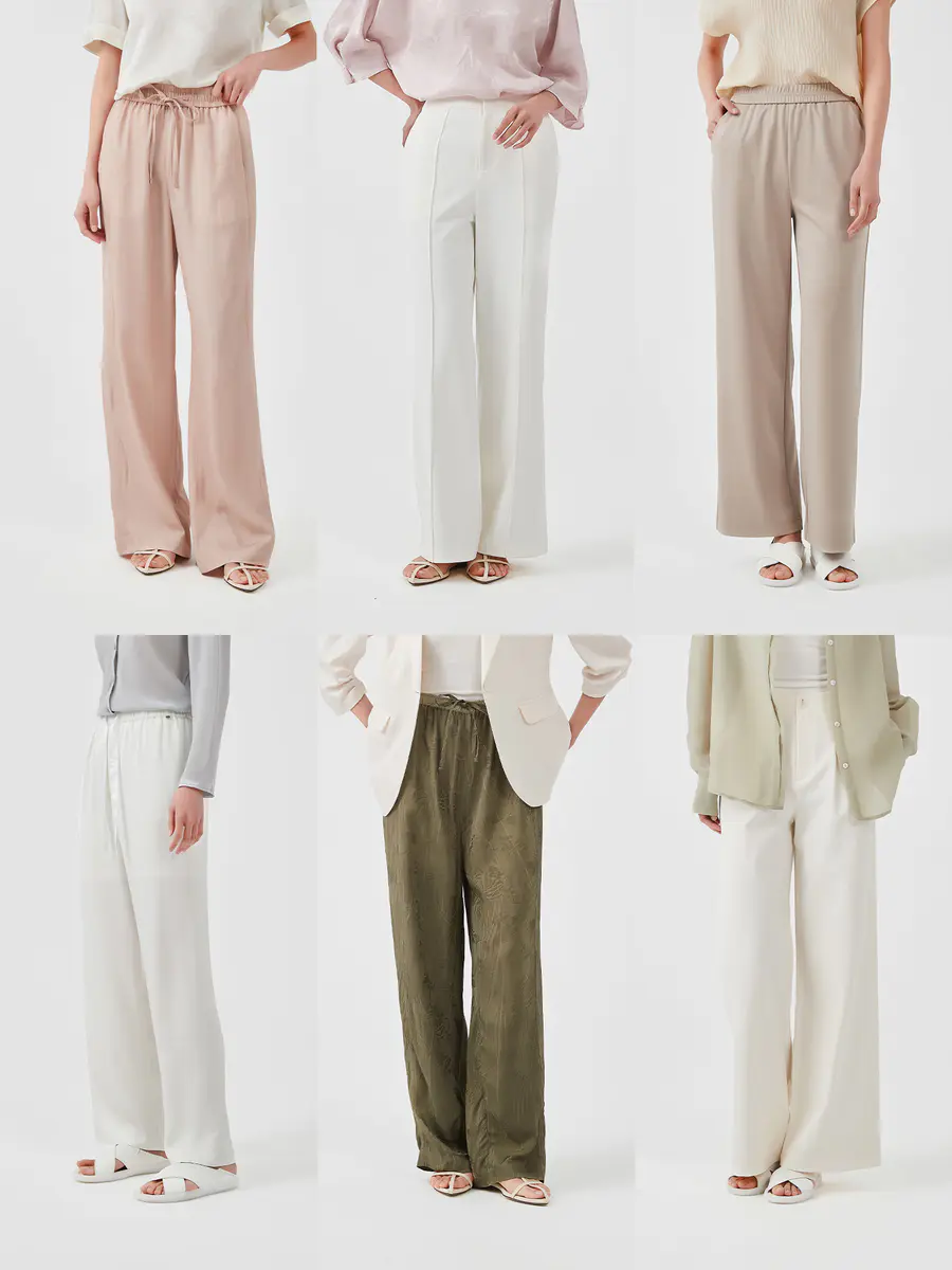 通过高腰、宽松裤腿等设计