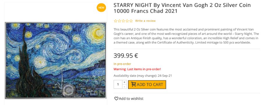 但在我的认知里,像乍得这枚采用矩形设计和超高浮雕来还原《星空》的币,目前为止仅有这一枚,真的极为漂亮。