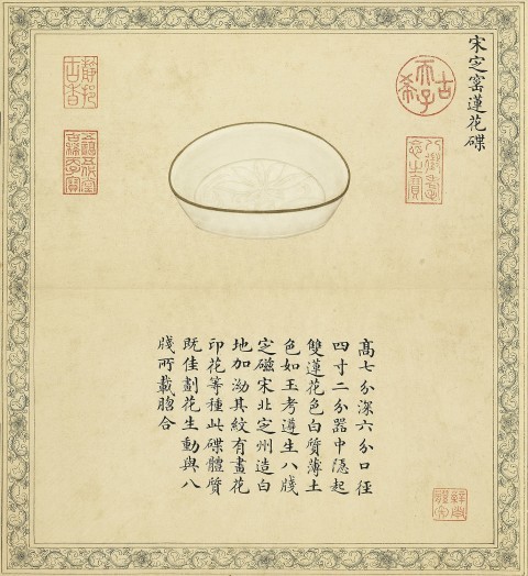《珍陶萃美册》 真实记录了乾隆皇帝典藏的历代名窑珍瓷。共画有十件瓷器,每页作对开装裱,上页为品名与图画,下页记录尺寸、釉色、形制、款识和前人的品评。通过图册,可以清晰地看到乾隆皇帝典藏过的历代陶瓷珍品。