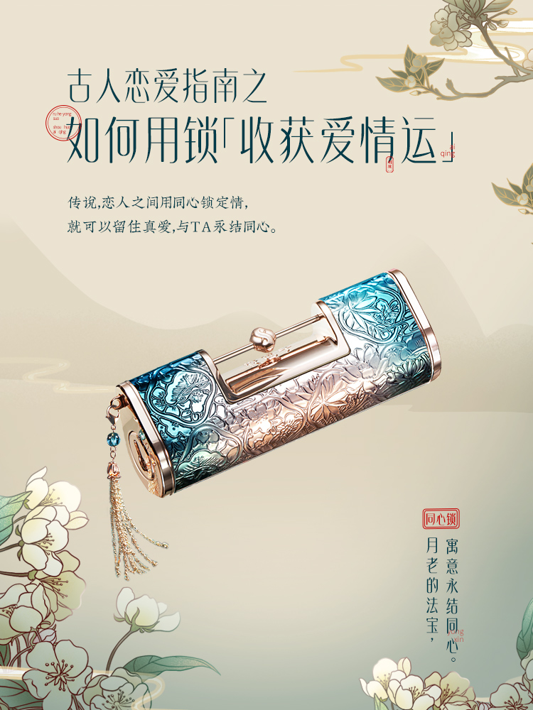 一把锁,记录着古人的爱情、婚姻、事业等方方面面,💗而今天我们也会将同心锁口红,赠予喜欢的人,表达心意。