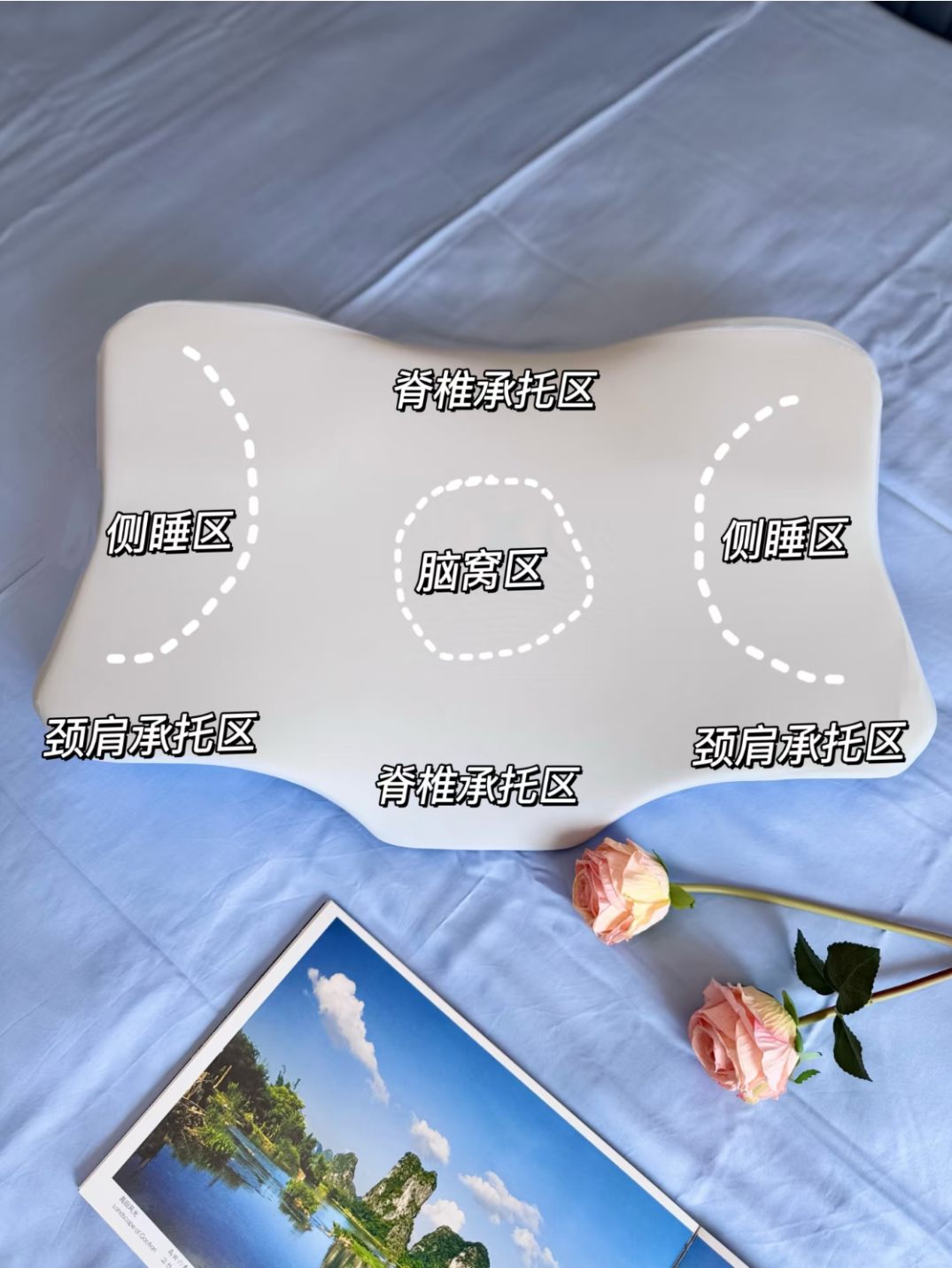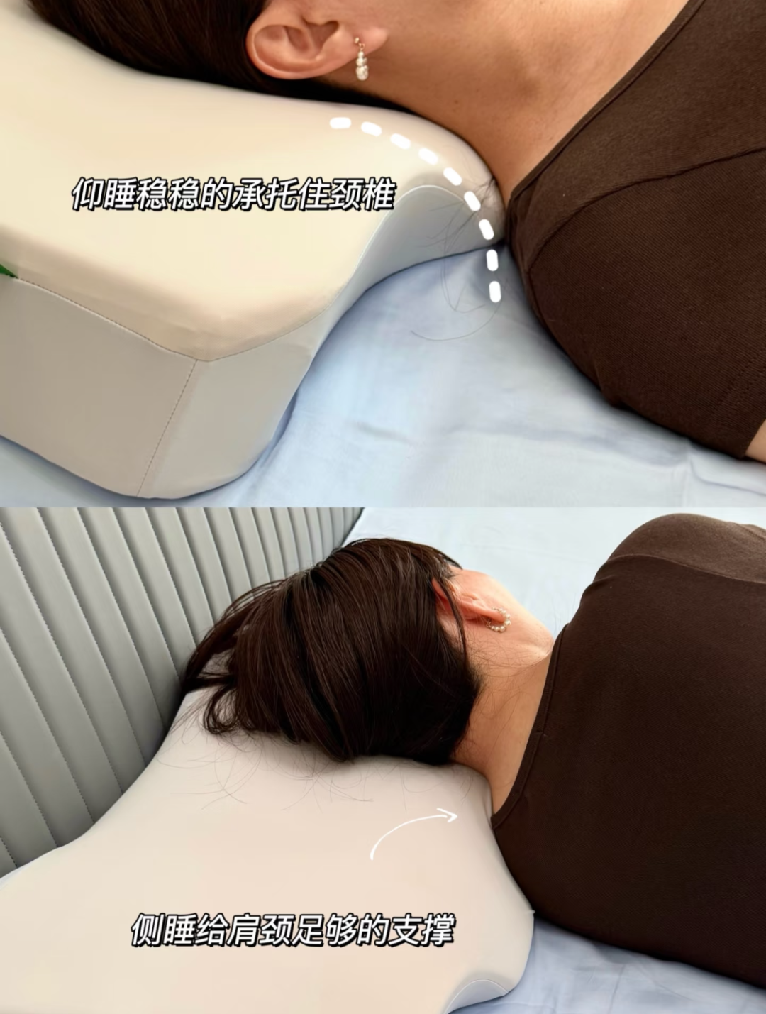 仰睡区:包裹式脑窝设计,稳固不跑枕,让颈椎始终保持自然前凸曲线。