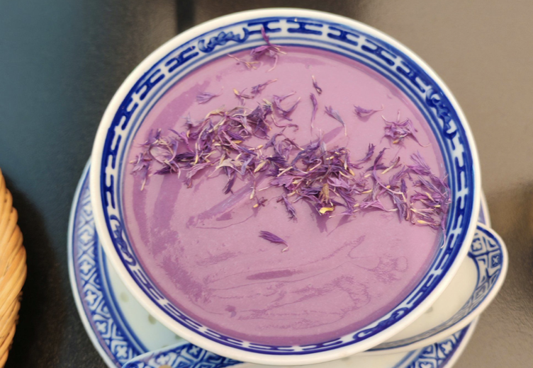 将紫薯去皮掰块,和温牛奶一起放入搅拌机,搅打成糊。