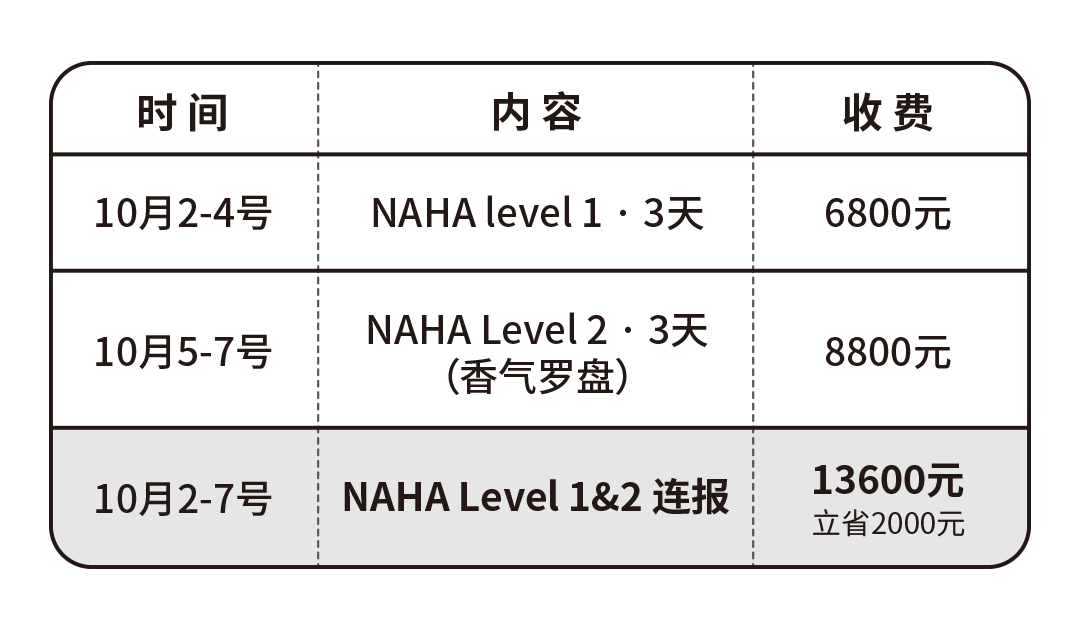 ● NAHA Level 2是在NAHA Level 1 的基础上的进阶或者说是细分,比如说这一次我们就会把其中香气与情绪的部分单独拿出来,做一个为期3天的模块:香气罗盘。