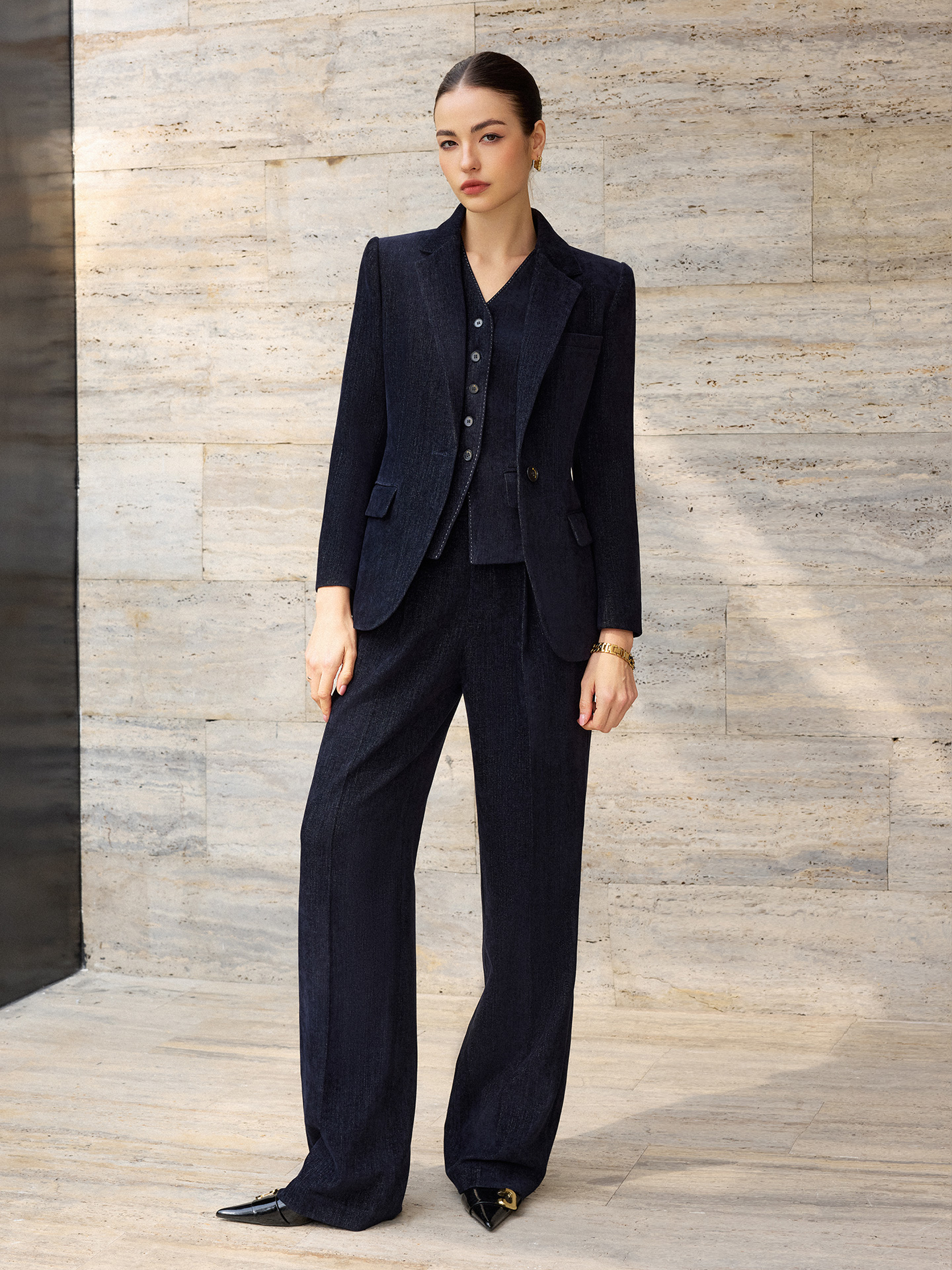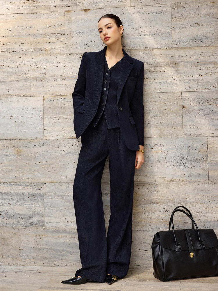 当牛仔的随性肌理,撞上西装的利落骨相,这套藏青色三件套,是献给都市女性的「通勤新叙事」。
