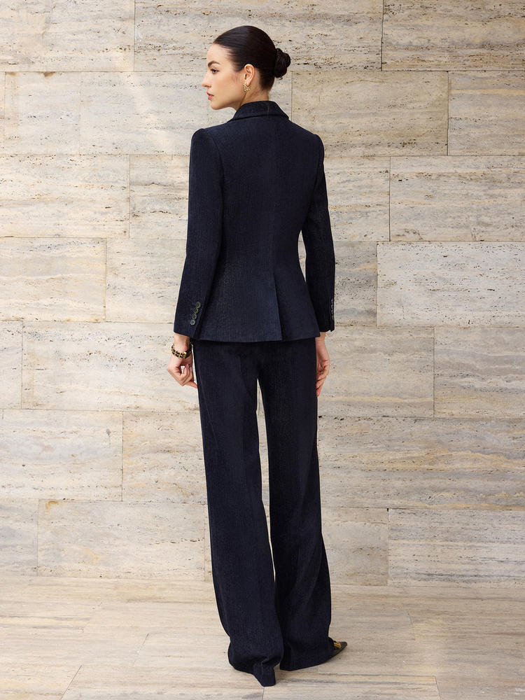 藏青底色里织入深浅不一的蓝调肌理,远看是沉稳的商务深蓝,近看是层次分明的细节质感,告别纯色西装的单调,又比普通牛仔多了三分精致。