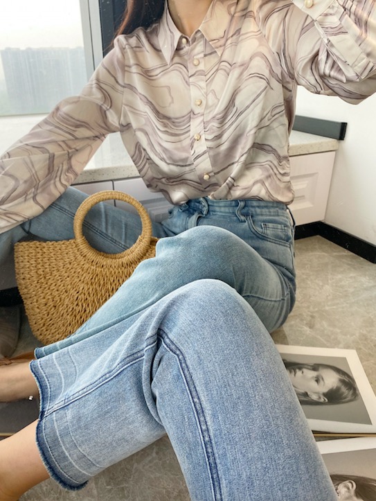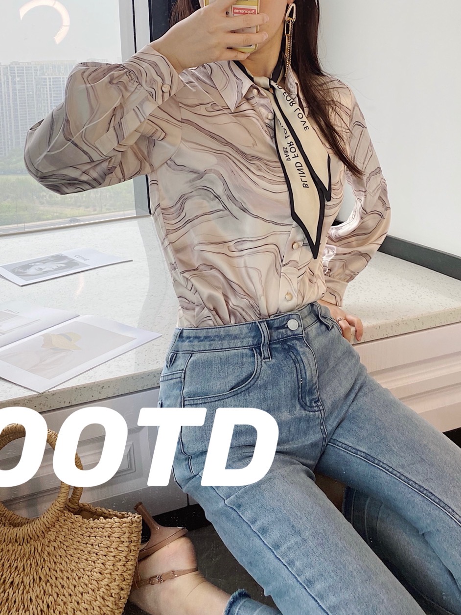衬衫+牛仔裤真的很难出错,更何况这件衬衫纹理和颜色都很独特,穿上气质马上不同了起来