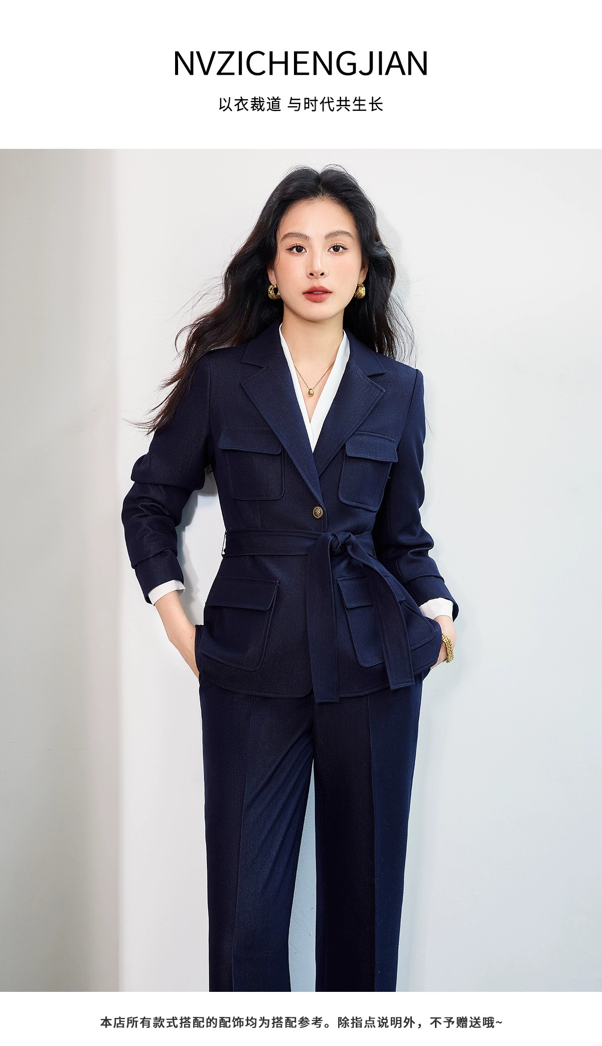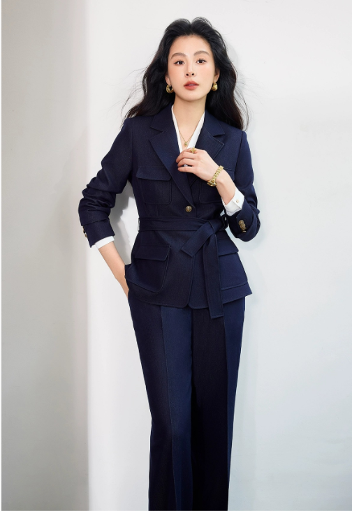 轻熟职场风西装套装,以简洁利落的裁剪和复古纽扣的点缀,平衡的干练感与精致感既有职场人的专业度,又带着轻熟女性的审美品味,适配当代职场的松弛氛围