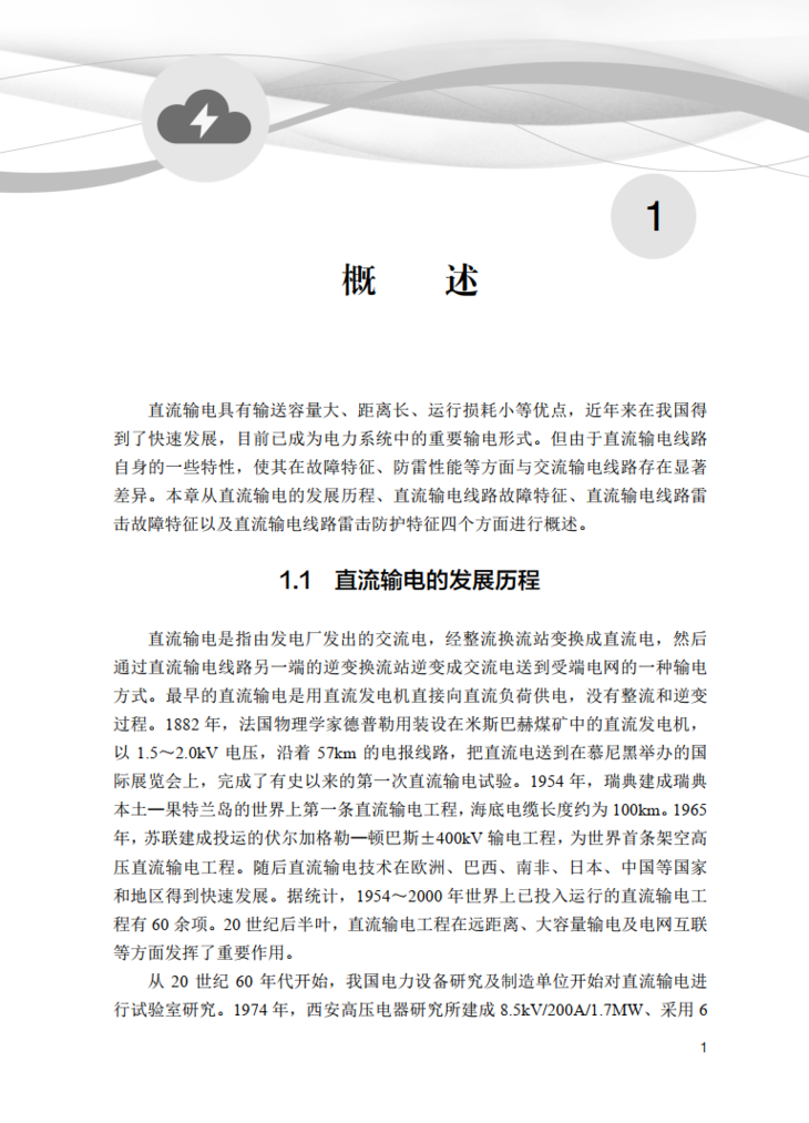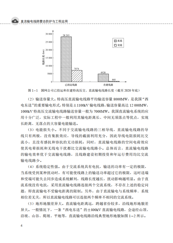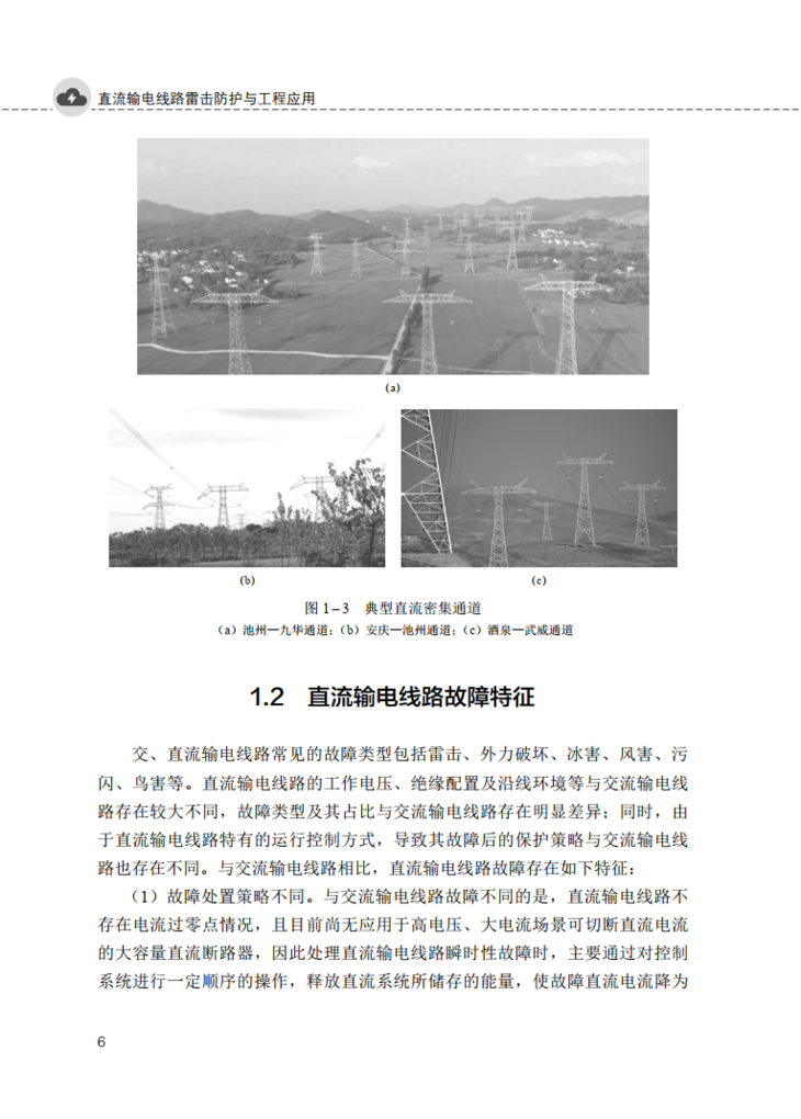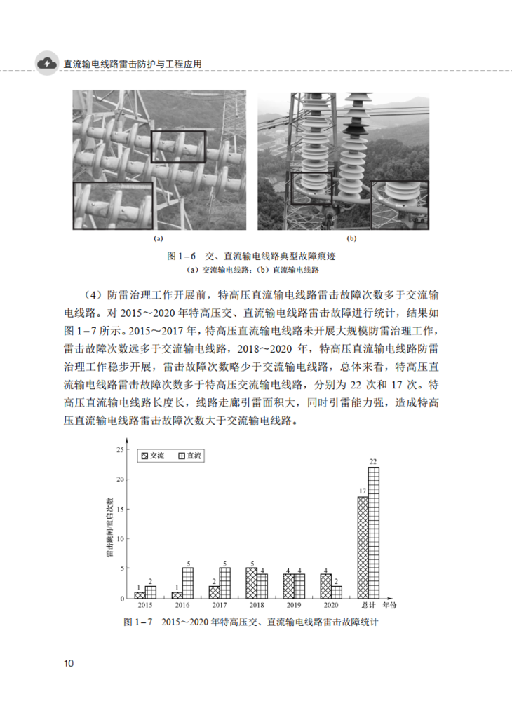 为进一步做好直流输电线路雷击防护工作,技术人员在已有研究基础上,紧密围绕直流输电线路雷击故障特征,相继开展了雷电预警主动防护、全通道雷害风险评估、雷击防护装备研发和雷击故障研判等关键技术研究工作,相关成果已在各电压等级直流输电线路上开展深度应用。目前,全通道雷害风险评估技术已应用于所有直流输电线路,掌握了线路雷害分布特征,为后期防治工作提供了科学依据;研制了各电压等级直流输电线路专用避雷器(简称直流输电线路避雷器或线路避雷器),并对雷害高风险区段进行针对性防护,且在多条线路上成功应用;研发了面向直流输电线路的分布式行波监测装置并实现大规模推广应用,为直流输电线路故障研判提供了关键数据支撑。经过长期不懈的努力,直流输电线路雷害得到有效控制,运维效率大幅提升,我国电网雷击故障重启率下降了 80%。为促进直流输电线路雷击防护关键技术及应用经验得到更好的推广,让从事直流输电线路雷电防护工作的技术研究人员及专业管理人员熟悉直流输电线路的雷击特征、防雷性能、治理策略、防护装备及应用场景,本书编者结合近年来相关研究成果和工程应用,编著完成了《直流输电线路雷击防护与工程应用》一书。