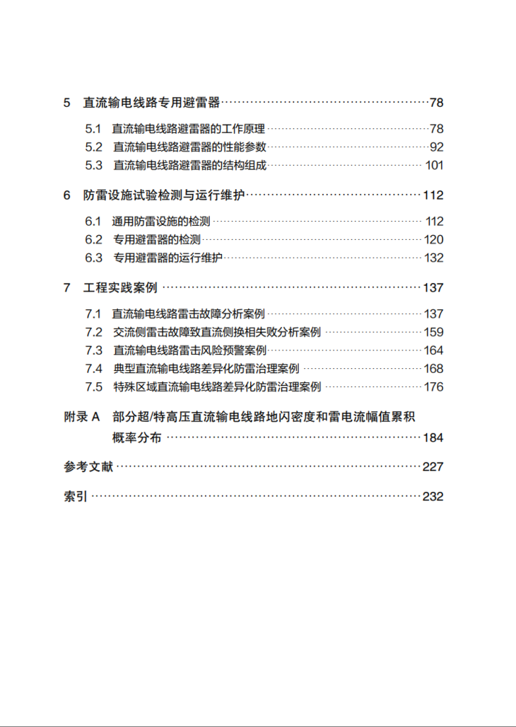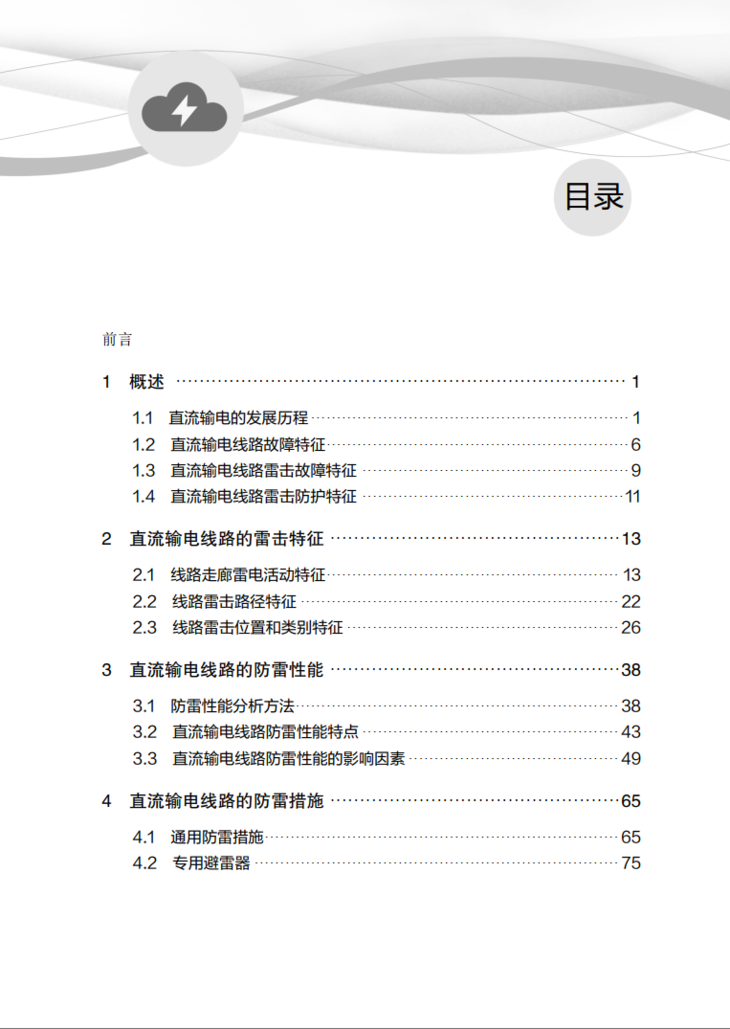 本书围绕直流输电线路雷击防护相关技术,较为系统、全面地阐述了直流输电线路的雷击特征、防雷性能、防雷措施、专用避雷器、防雷设施试验检测与运行维护、工程实践案例等内容。全书共 7 章,第 1 章概述了直流输电的发展历程及故障特征;第 2 章介绍了直流输电线路的雷击特征;第 3 章介绍了直流输电线路的防雷性能;第 4 章介绍了直流输电线路各防雷措施的优缺点及适用性;第 5 章介绍了直流输电线路专用避雷器的工作原理、性能参数及结构组成;第 6 章介绍了防雷设施试验检测与运行维护要求;第 7 章介绍了典型的工程实践案例。