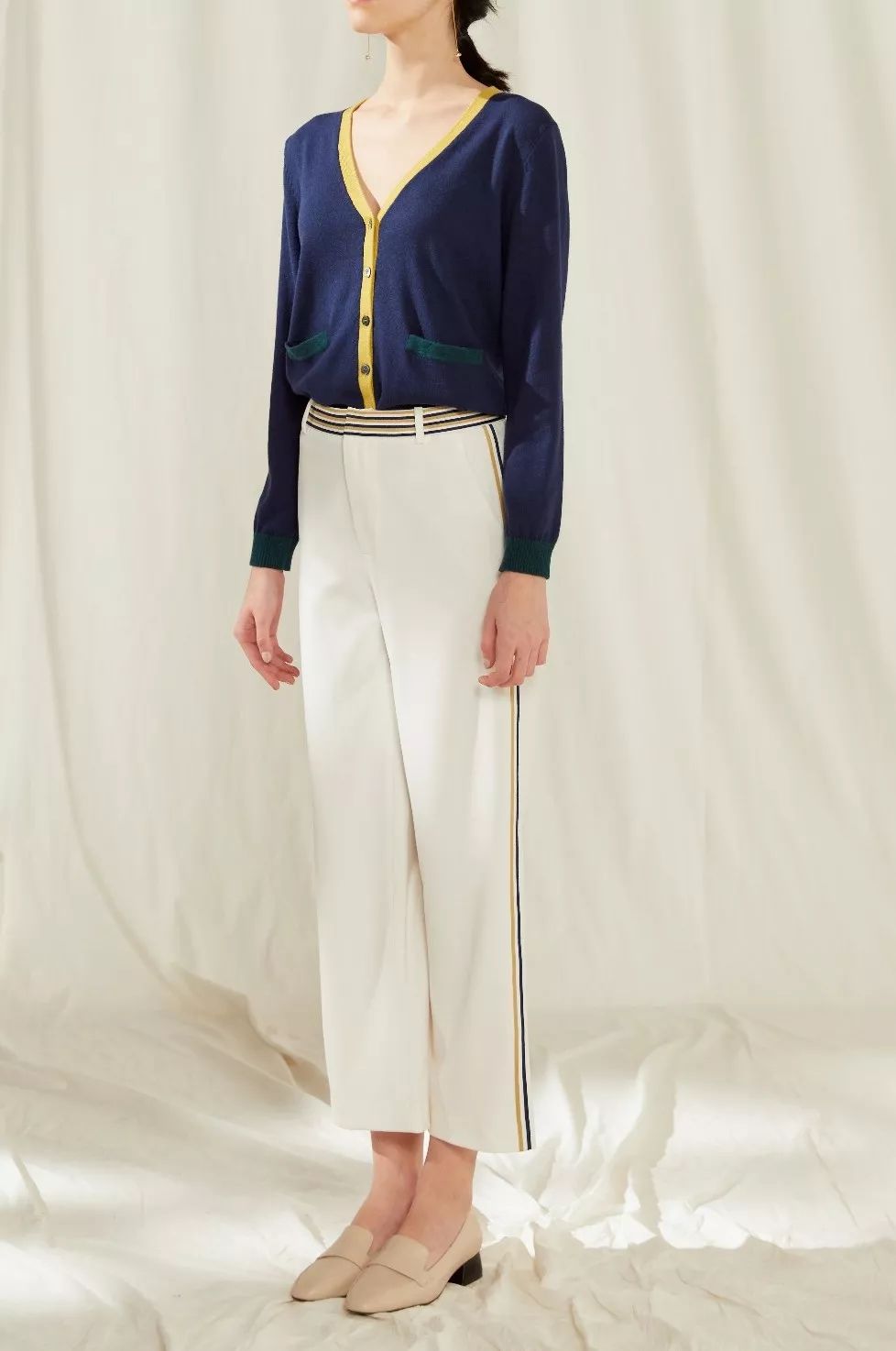 有些白裤子会有层次单薄的问题,这件腰头自带装饰,强调了高腰线,同时拉长腿型。清爽的黄绿织带春意昂扬,为它增加了独特的魅力。▼