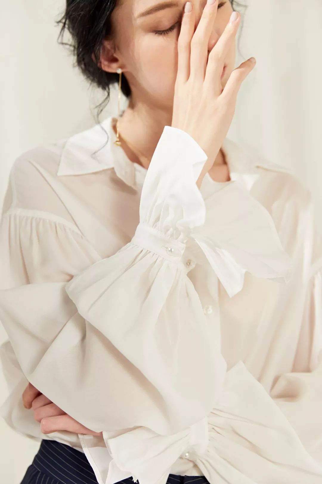廓形、泡泡袖、珍珠扣、大摆荷叶边尽显女性的柔美,这些繁复的元素需要用透明感来中和,上身才不显沉重,还格外灵动纤柔。▼