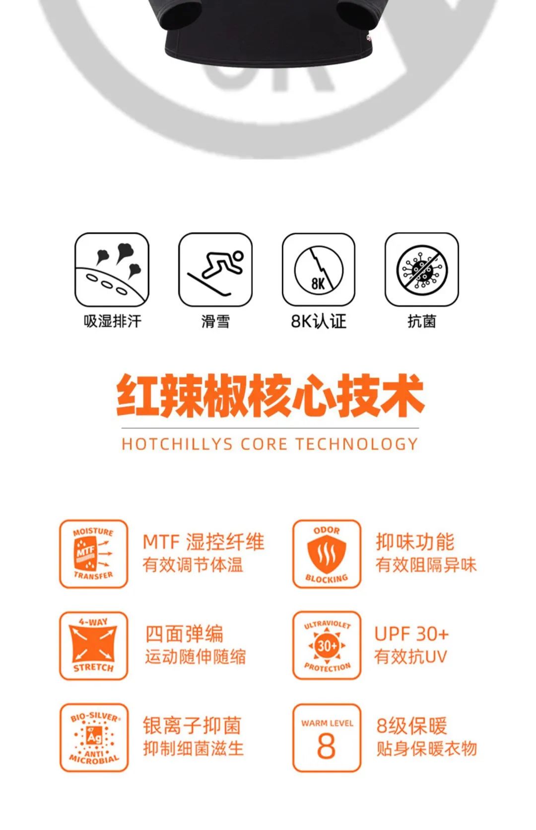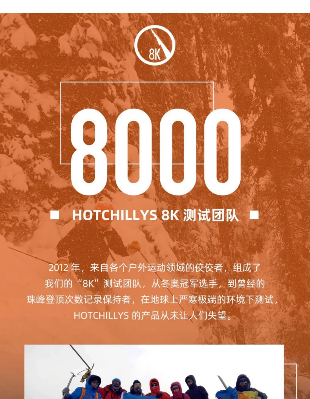 为了应对“极大温差,极端降水,超高湿度,使用者本身大量排汗以及需长时间穿着” 的客观使用环境,HOTCHILLYS提炼出应对这些客观环境时服装的技术指导,要求服装具有:保暖,导湿,排汗,快干,抗菌,舒适等功能性。