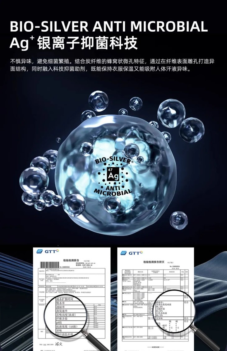 银离子抑菌技术和美国专利技术(专利号2763614)、MTF水份转运纤维、四针六线平缝工艺、天然甲壳素、OBP异味控制工艺、UPF抗紫外线处理和热升华印花技术。