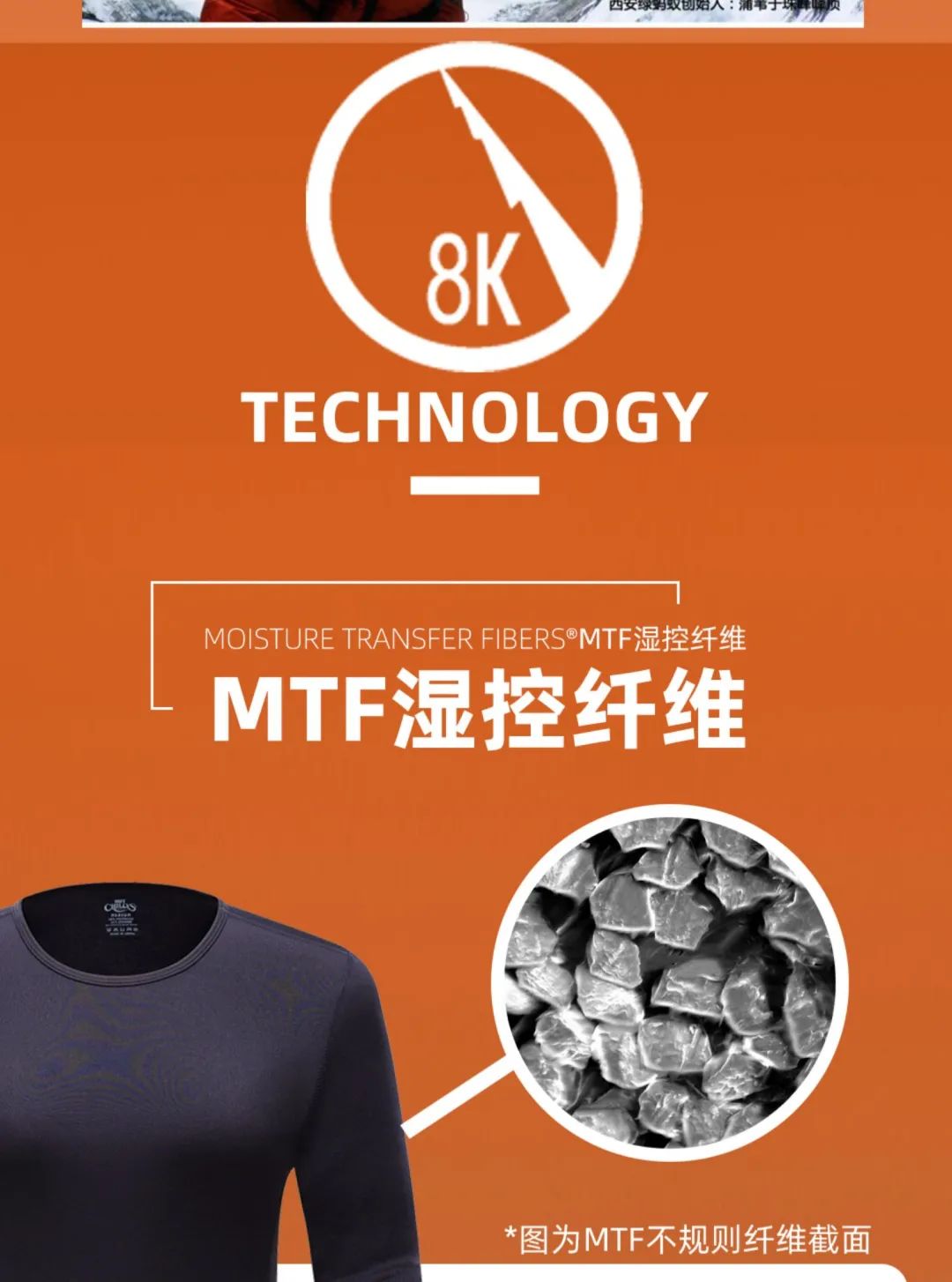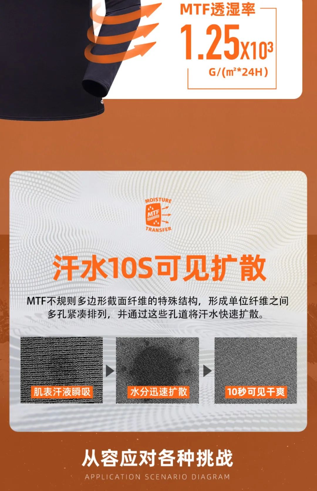与此同时,将MTF纤维与其它纤维混纺成为不同形态,保证速干透气的同时,达到锁温保暖的效果。