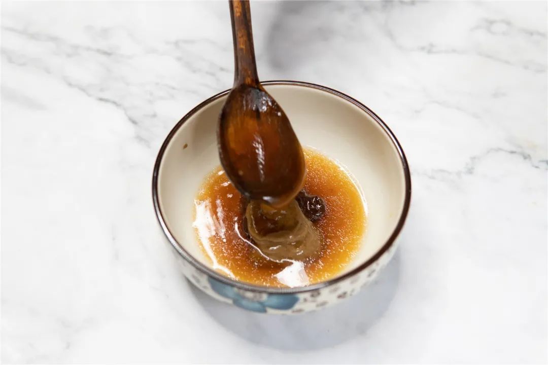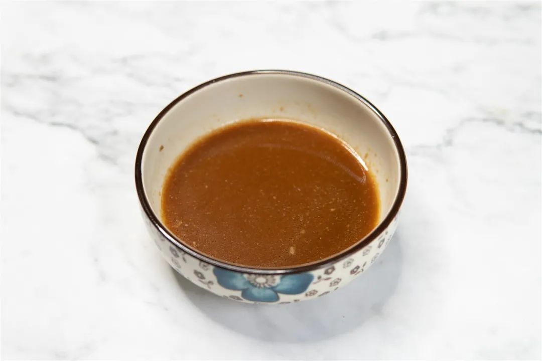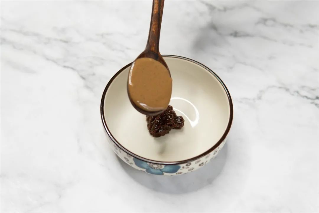 5、取一个小碗,碗中加入芝麻酱、豆瓣酱和三勺卤煮汤,搅拌均匀后放一旁备用。