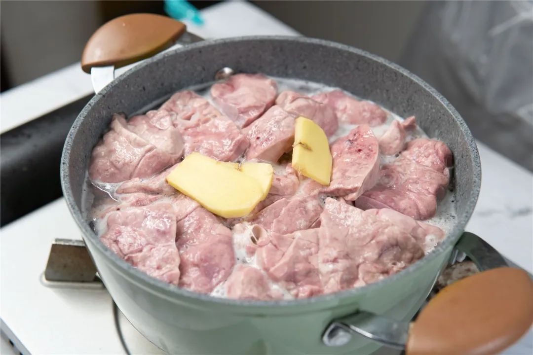 1、猪肺洗净切块,起锅加清水,放入猪肺,并加姜片去味,沸腾后焯水捞出备用。(Tips:荤素菜焯水方式不一样,通常素菜焯水用开水,肉类焯水用冷水)