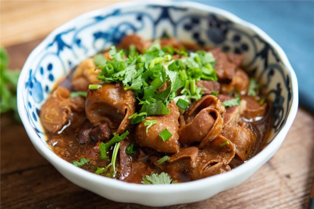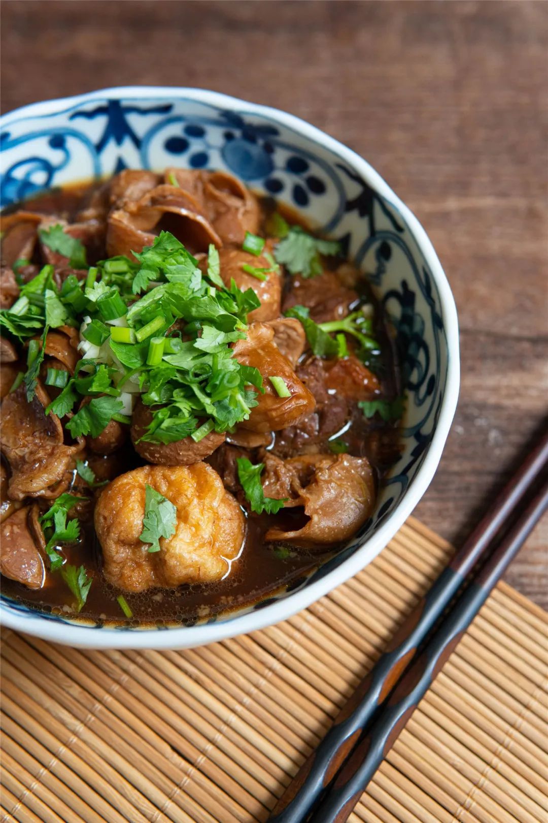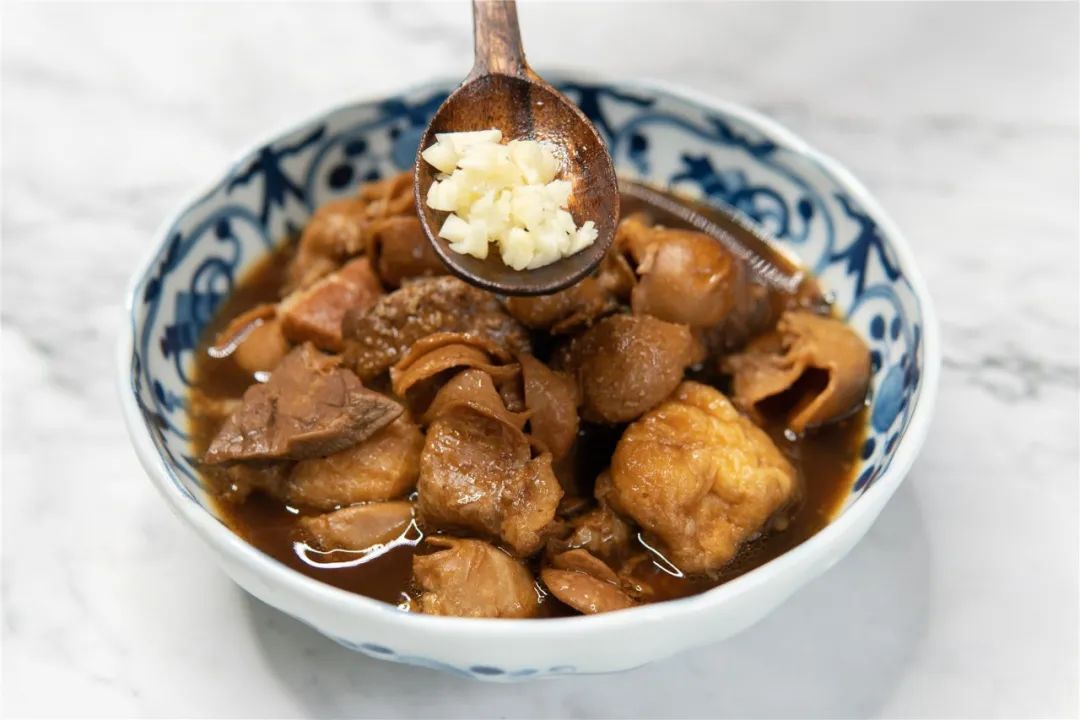 7、卤煮出锅后淋上调好的酱汁,撒上蒜末和香菜,大功告成!