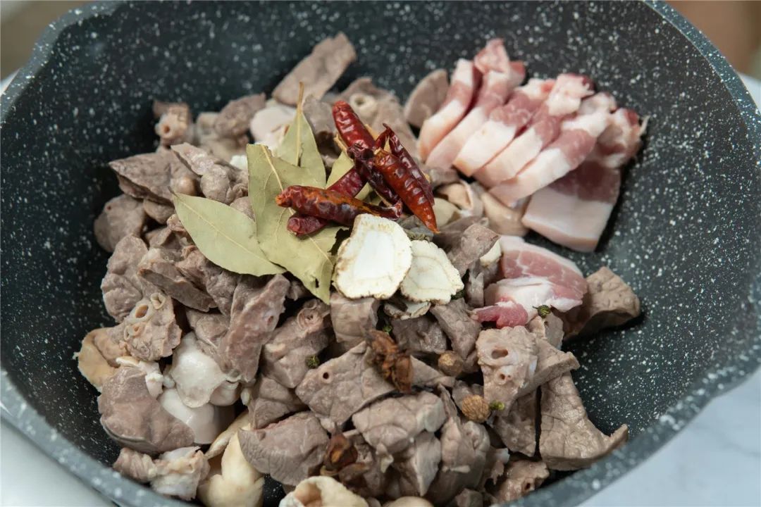 3、将焯水后的猪下水倒入锅中,加入切片五花肉,加清水煮开。