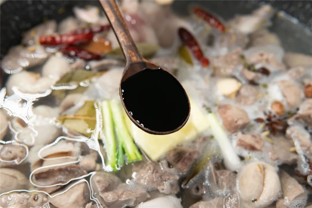 4、加姜葱去腥,加老抽和米酒调味(视频中加了三大勺老抽,大家也可以根据口味加点盐)。