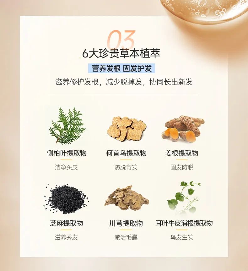 此外还有黑芝麻、川芎、耳叶牛皮消等多种名贵中药,在补充毛囊所需营养的同时,帮助巩固发根,减少掉发和断发。