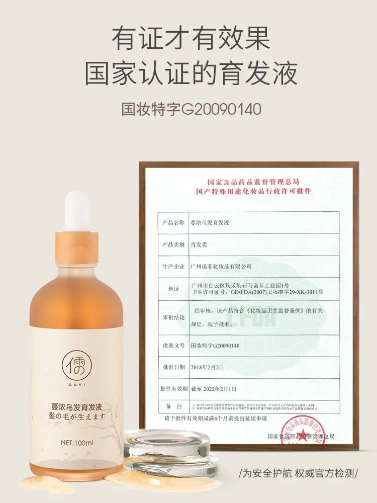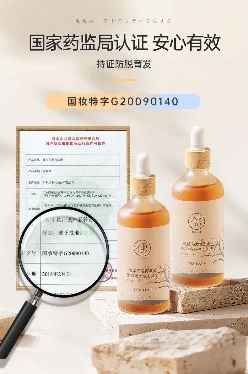 凭借着优秀的使用效果,这款育发液还获得了国家药监局颁发的防脱育发国妆特证。