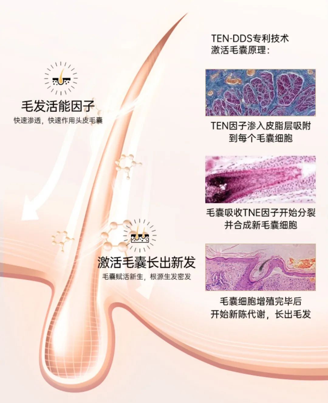 TEN因子(毛发活能因子)能够渗入皮质层促进毛囊细胞生长,让受损的毛囊细胞重获新生,从而开始新陈代谢,长出新的毛发。