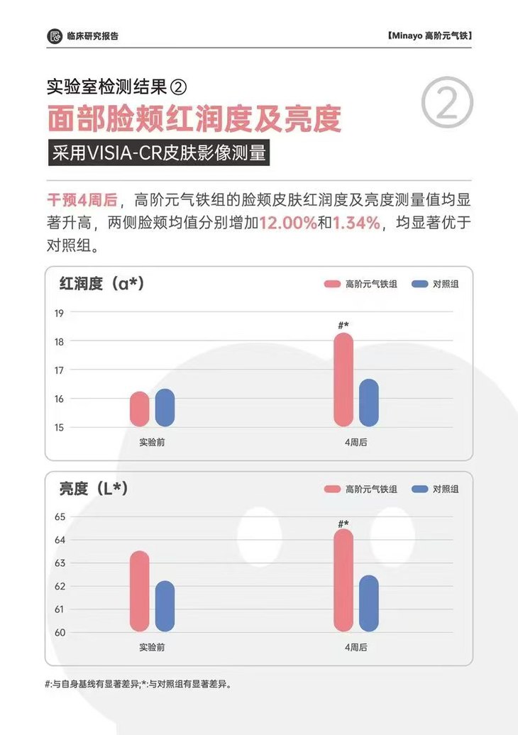 综合研究结果,连续服用美那有Minayo高阶元气铁产品4周能有效改善生活质量,提升健康状况满意度,降低身体疼痛对处理事情的妨碍和日常生活中对医疗帮助的依靠,丰富应付日常生活的精力,提高行动能力和注意力集中度,提升对自身睡眠情况、从事日常活动的能力、工作能力和对自己的满意度:有效减少经期的血块和失眠情况:有效改善脱发、手脚冰凉和手脚肤色暗黄:有效提高血液血红蛋白和铁蛋白含量:有效改善脸颊皮肤红润度和亮度:有效改善血液循环。