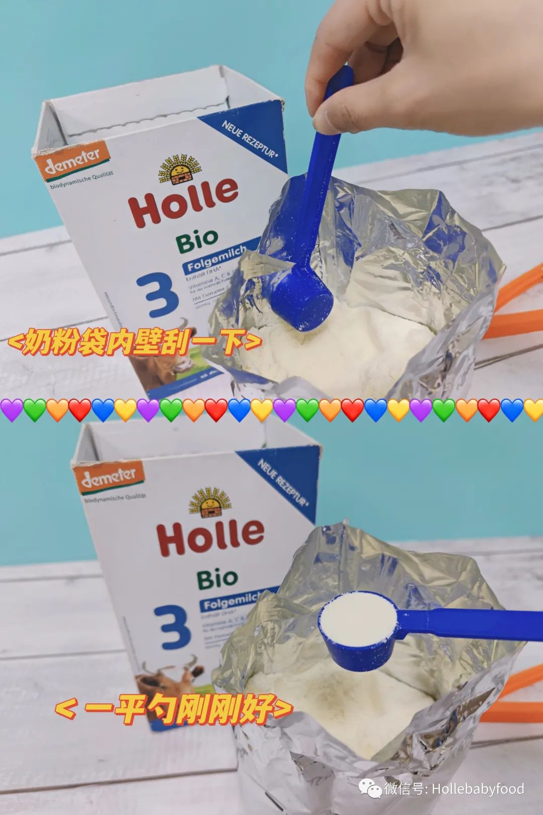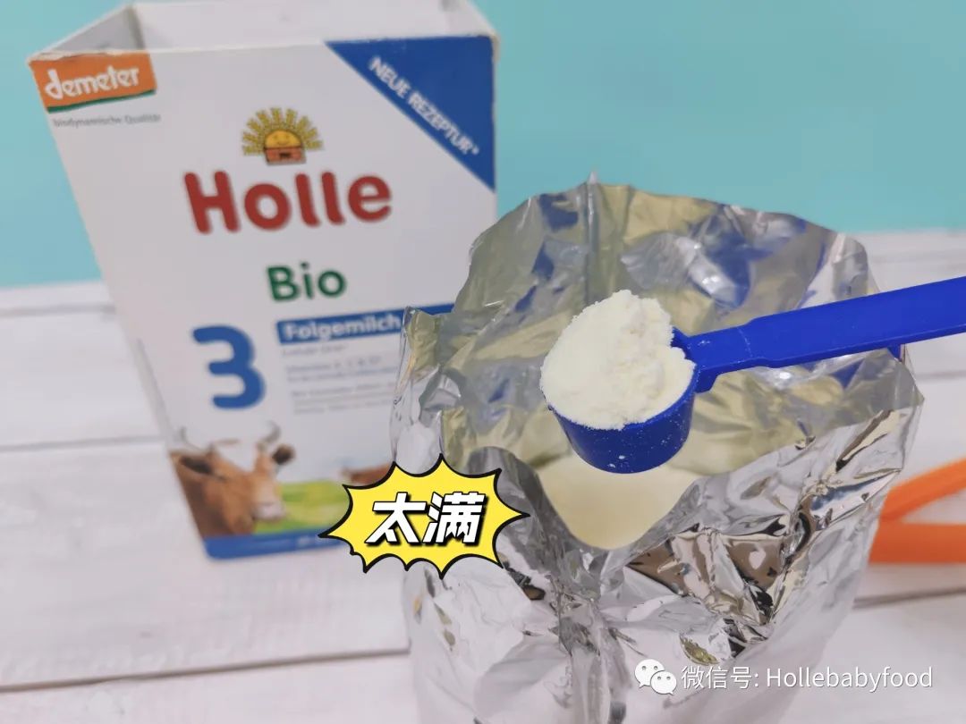 除了这一点,爸妈还要注意,一定要用奶粉自带的定量勺来舀奶粉,水也要按照奶粉包装上的比例来冲调。水的温度也要按照包装上的要求,Holle有机奶粉建议水温是50度左右哦。