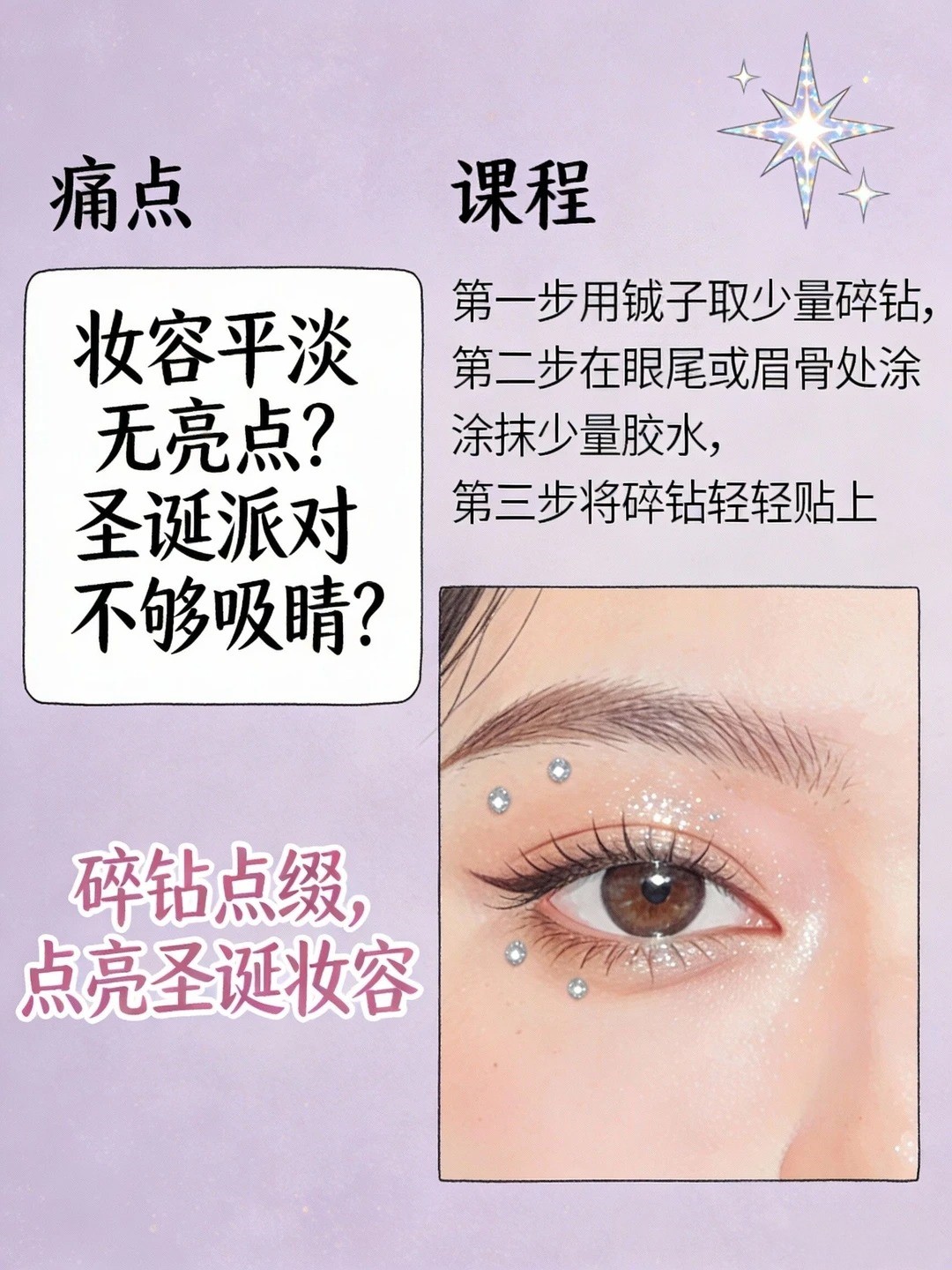 重点来啦!在卧蚕中段和眼头下方点几颗细闪碎钻(用指腹点涂更服帖),眨眼间blingbling的,像把圣诞星光揉进了眼睛里~ 这步是氛围感密码,绝对不能省!✨